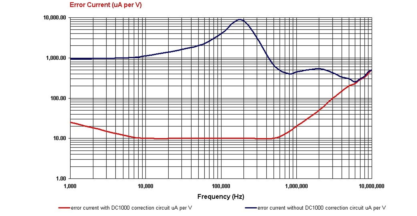 DC1000A 还具有专有的交流校正电路,可将这些交流误差电流降低高达 100 倍,从而立即提高测量精度。